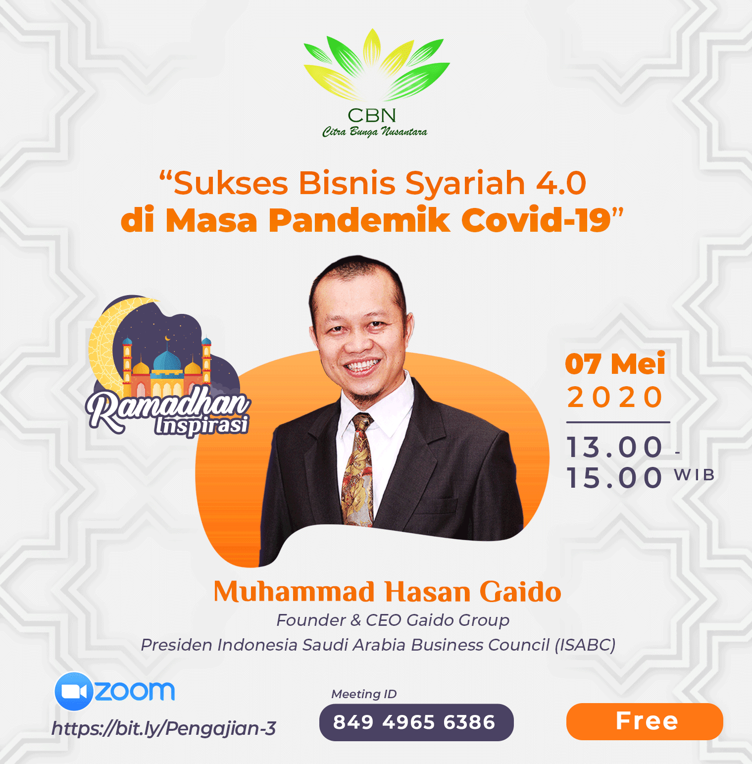 GAIDOFOUNDATION.ORG-Citra Bunga Nusantara (CBN) menggelar Kajian Ramadhan seri ke 3 ”Sukses Bisnis Syariah 4.0 di Masa Pandemik Covid-19” secara virual melalui Zoom App, pada (07/05) pukul 13.00-15.00 WIB dengan narasumber Muhammad Hasan Gaido, Faounder & CEO Gaido Group, sekaligus menjabat sebagai Presiden Indonesia Saudi Arabia Business Council (ISABC), dimoderatori oleh Agus Kusumaramdhani.