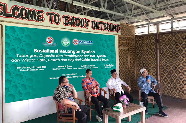 GAIDOFOUDNATION.ORG-Sebanyak 30 pengurus FSPP Banten dari 8 Kabupaten dan Kota, Pengurus Koprasi Syariah Amanat Nusantara (KSAN) Indonesia dan Pengurus PUB hadiri kegiatan “Sosialisasi Keuangan Syariah Tabungan, Deposito dan Pembiayaan dari BAF Syariah dan Wisata Halal, Umrah dan Haji dari Gaido Travel & Tours” pada Senin (5/01) di Kawasan Wisata Halal Baduy Outbound. Hadir sebagai pembicara KH Anang Azhari Alie, Ketua Presedium FSPP Periode 2021, Dr. Fadlullah Sekjen FSPP, Asep Swarna, Direktur Utama BAF Syariah, dan Nana Sujana, Direktur Gaido Travel & Tours.